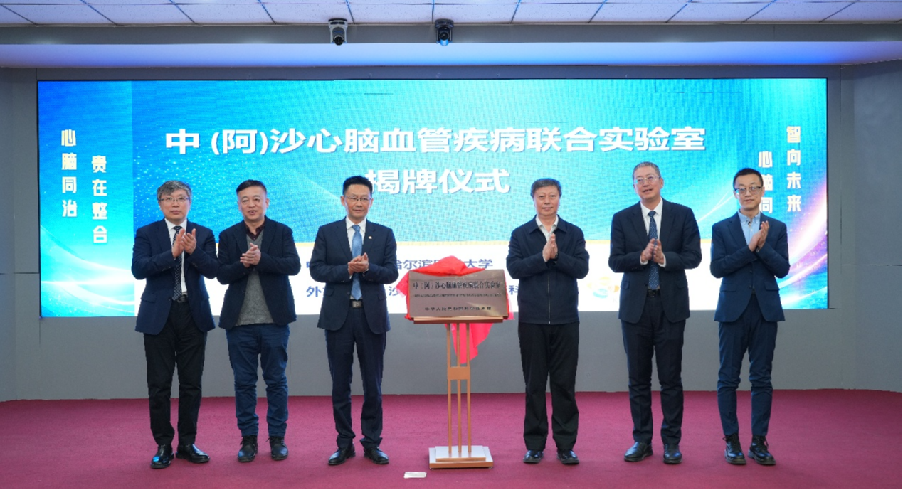 在全体与会人员的共同见证下,黑龙江省科技厅石兆辉副厅长、哈尔滨医科大学季勇校长、哈医大一院孙备院长和黑龙江省科技厅外国专家服务与对外合作处王海泉处长共同为“中(阿)沙心脑血管疾病联合实验室”揭牌,这一国际科技合作平台正式投入运行。
