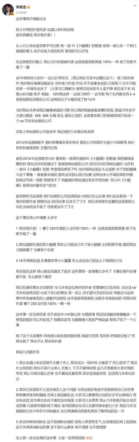 李荣浩也特别强调,除了这起“乌龙事件”,“其他部分网友提到那些歌,就是打死我,骂死我,把我祖坟刨了,把我头剃了,我也不认,我没有抄袭。”