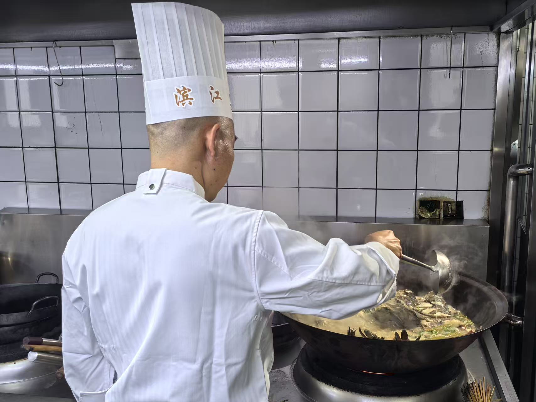 揭彩仪式后,主持人向在场群众生动讲解开江节的悠久历史与文化内涵。开江习俗传承千年,承载着松花江沿岸儿女对母亲河的敬畏与感恩,寄托着对风调雨顺、岁岁安康的美好期盼。在工作人员引导下,群众走进后厨,近距离观摩开江鱼传统烹饪技法。从活鱼处理、配料炒制到慢火炖煮,每一道工序都尽显匠心,大家直观感受地道江鲜烹制技艺,领略舌尖上的非遗魅力。