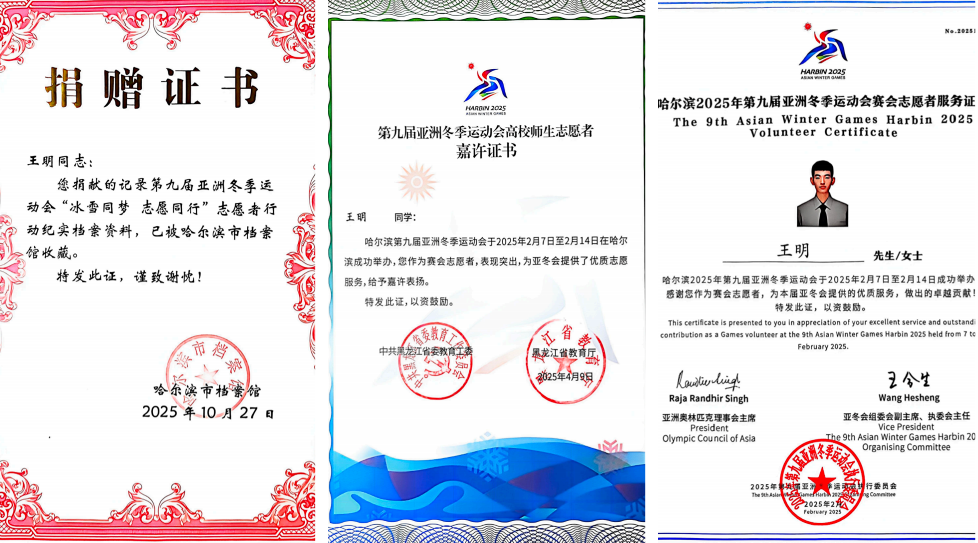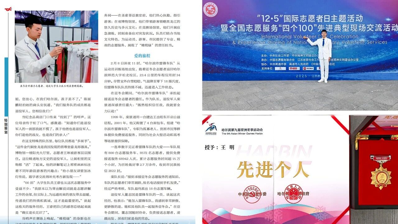 他的事迹被央视报道,并被《中国退役军人》杂志专题刊登,其服务纪实档案也被哈尔滨市档案馆收录。他还受邀参加全国志愿服务交流活动、亚冬会总结表彰大会,荣获亚冬会高校志愿者师生嘉许、哈尔滨市先进个人等多项荣誉,成为校园中当之无愧的“青春榜样”。