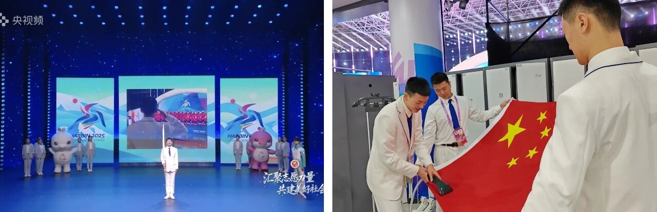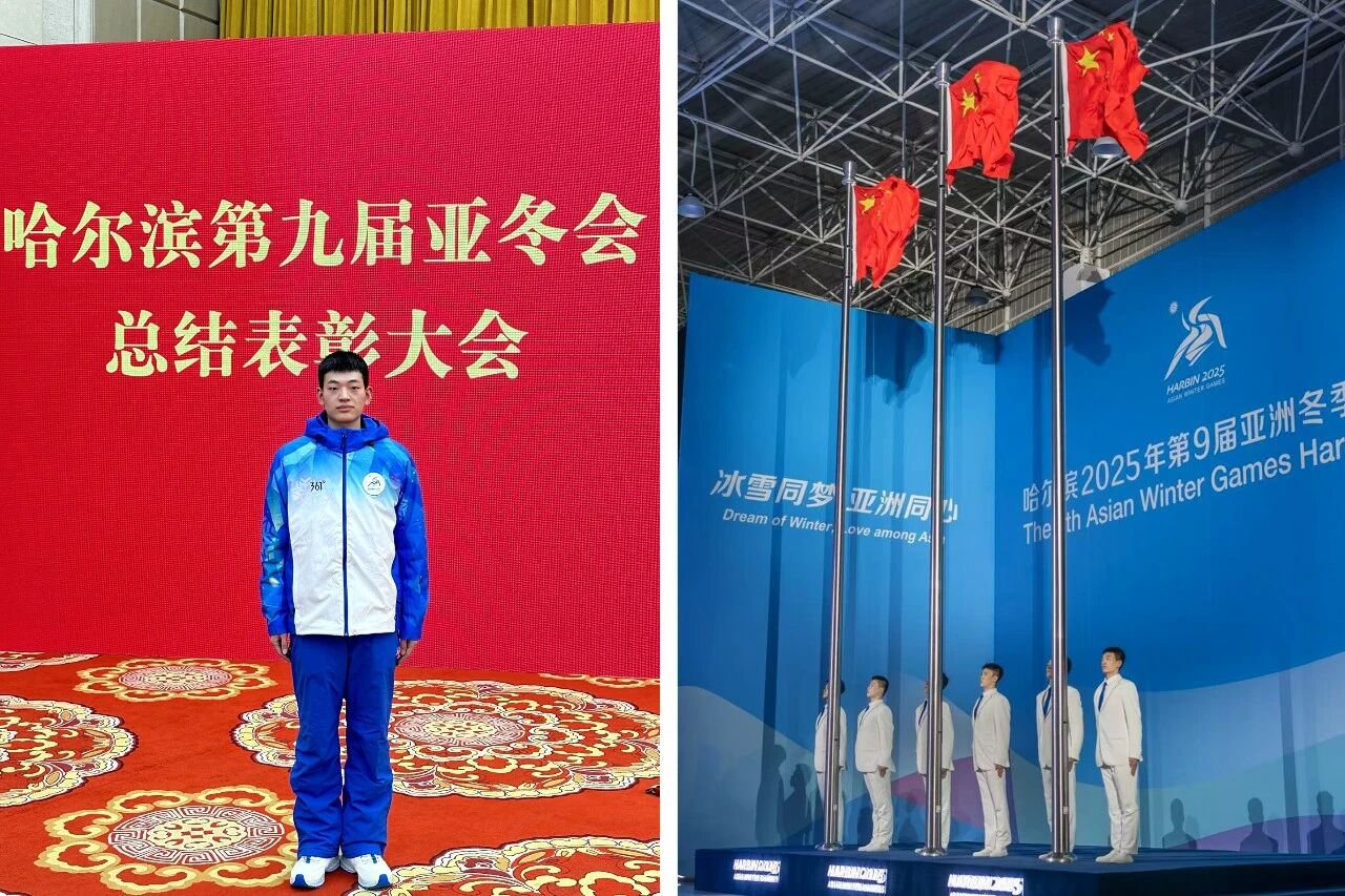 2025年第九届亚冬会在哈尔滨举办,王明主动申请担任升旗手。为圆满完成任务,他提前进行了500余小时专项训练,从动作规范到节奏把控,每一个细节都精益求精。赛事期间,他圆满完成32场颁奖升旗任务,累计服务超300小时,以严谨的态度与挺拔的身姿展现中国青年风采。