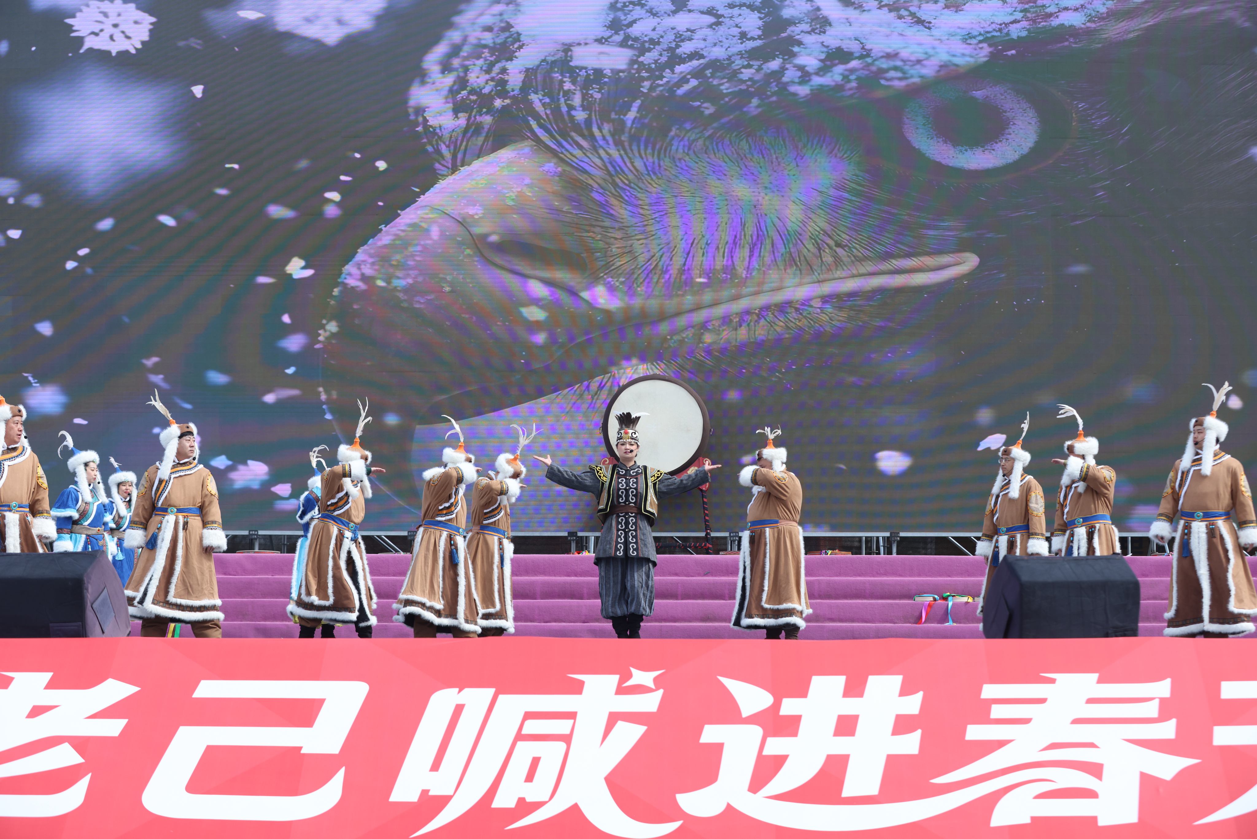 9时18分,祈福仪式正式开启。25位赫哲族萨满身着鱼皮衣,踏着《温吉尼》的节奏,用最古老的韵律唤醒沉睡的江河。萨满们以最虔诚的姿态,面朝松花江,祈求风调雨顺、国泰民安,唤醒沉睡一冬的江水与生灵 。