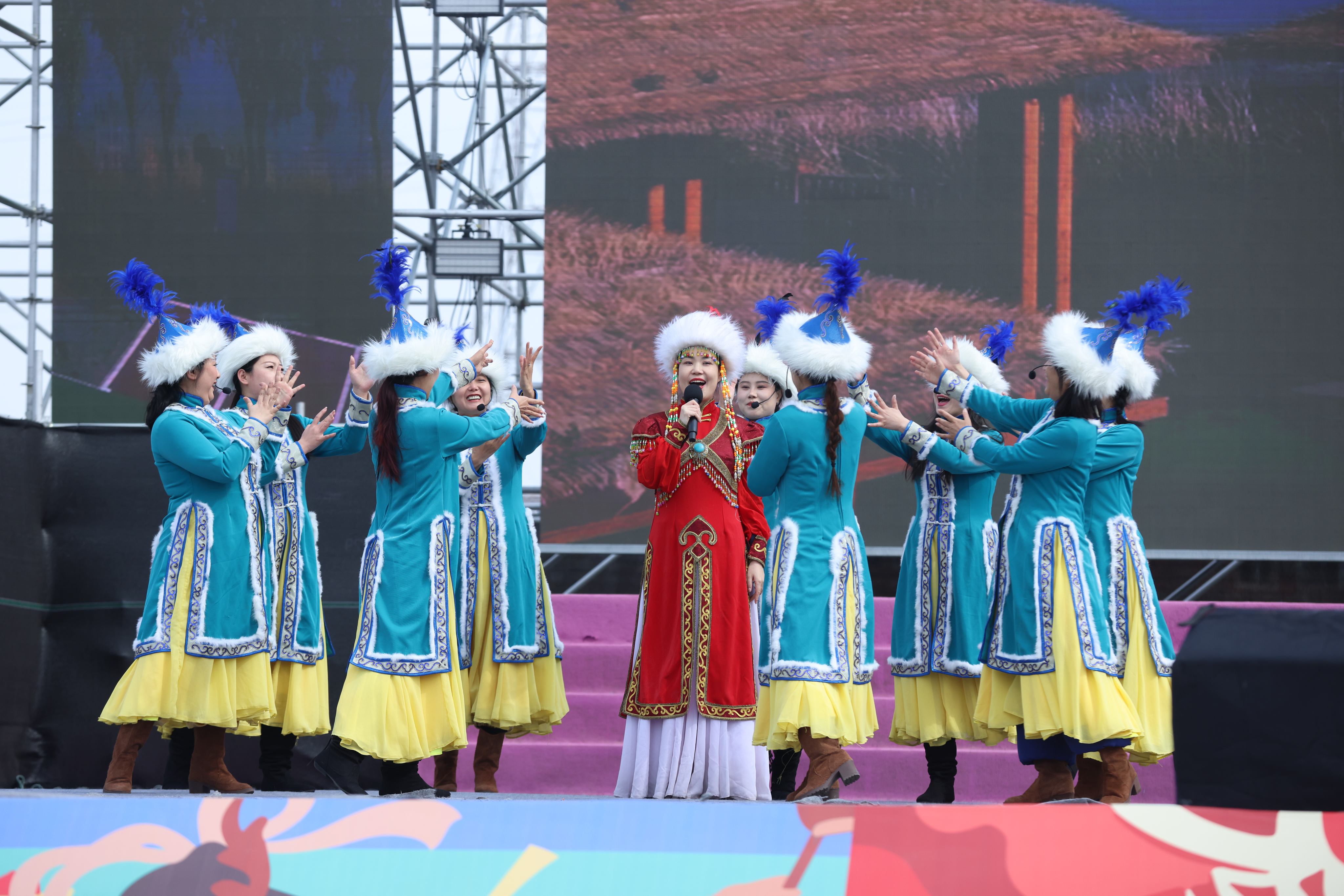 文艺演出环节将现场氛围推向高潮。史诗舞乐《女真九歌》重现古代生产生活场景,舞者的身姿刚劲有力,诉说着北方民族的豪迈与坚韧;江畔民谣悠扬婉转,唱出佳木斯松花江畔的春日故事。台下网红达人们抢抓热点,观众不时鼓掌喝彩,一同畅享这场传统与现代交融的文化盛宴 。