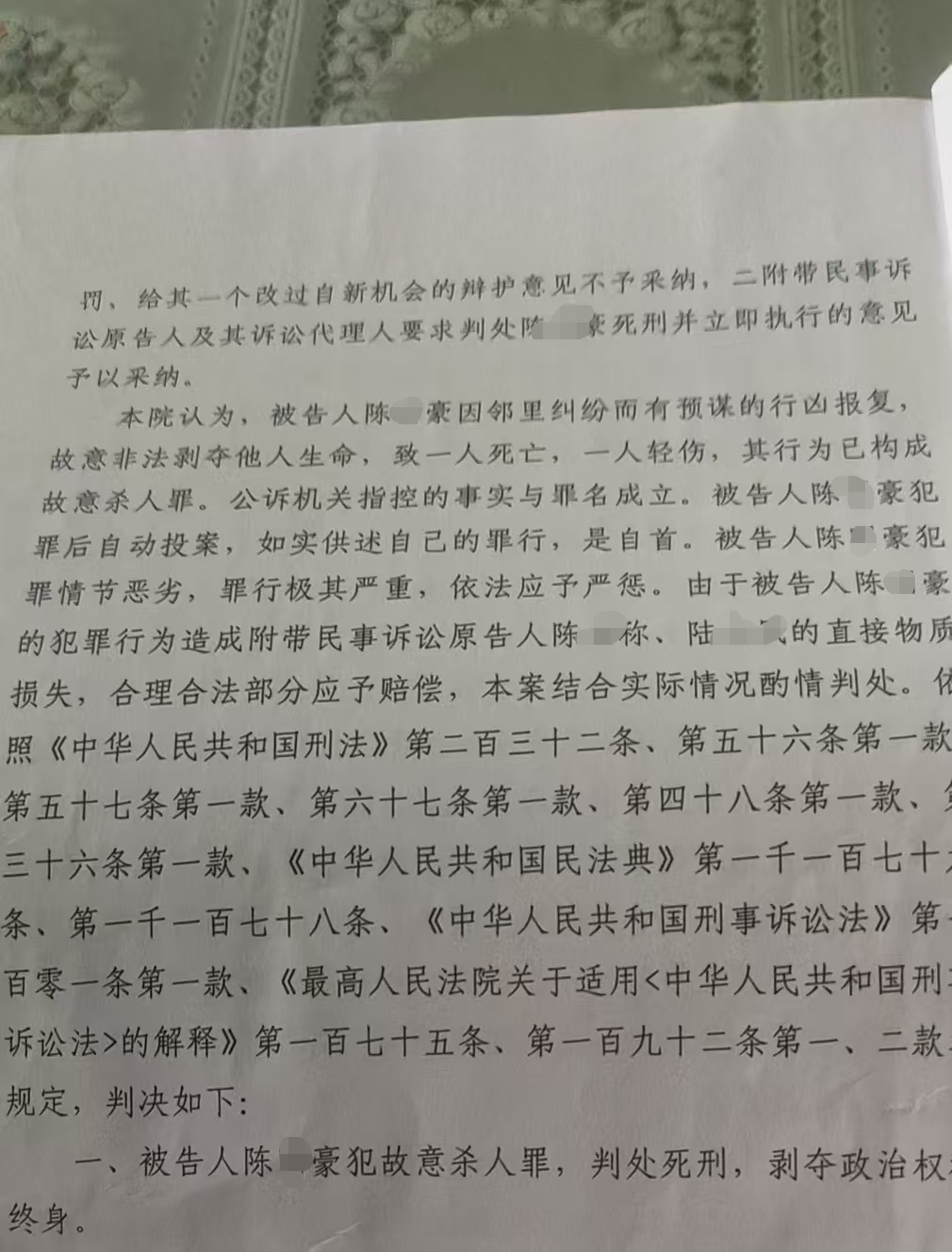 黑龙江网讯(记者 王可欣)4月14日,记者从被害人家属陈女士处获悉,“男子网购长矛行凶致邻居一死一伤”案宣判:被告人陈某豪犯故意杀人罪,判处死刑,剥夺政治权利终身。法院认为,被告人陈某豪虽有自首情节,依法可以处罚或减轻处罚,但鉴于其犯罪情节恶劣,罪行极其严重,未对其从轻处罚,依法应予严惩。