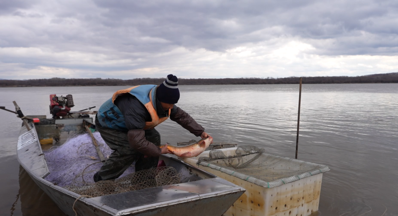 在乌苏里江虎头段,随着流冰期结束,虎林渔民位龙敏行船赶江、撒网捕鱼。有着34年捕鱼经验的他,早已摸清江水规律,开江前便备好渔具,凭借勤撒轻拉、缓收紧守的娴熟技巧,一开江就喜获满舱渔获,收获春日里的第一份丰收喜悦。位龙敏说,今天打捞五六十斤渔获,一网平均二十多分钟,有鲤鱼、狗鱼、鲫鱼、虫虫(唇䱻),一网鱼能卖一千多块钱。开江鱼味儿美,鲜透,肉质肥美,特别好吃。
