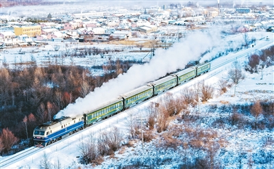 内蒙古自治区呼伦贝尔市根河市金河镇所在的大兴安岭林海雪原间,列车正平稳穿行。马 赫摄(人民图片)