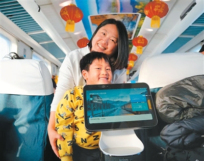 4181次列车上,机器人“小铁”与旅客互动。中国铁路哈尔滨集团有限公司供图