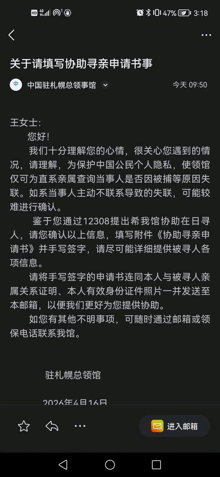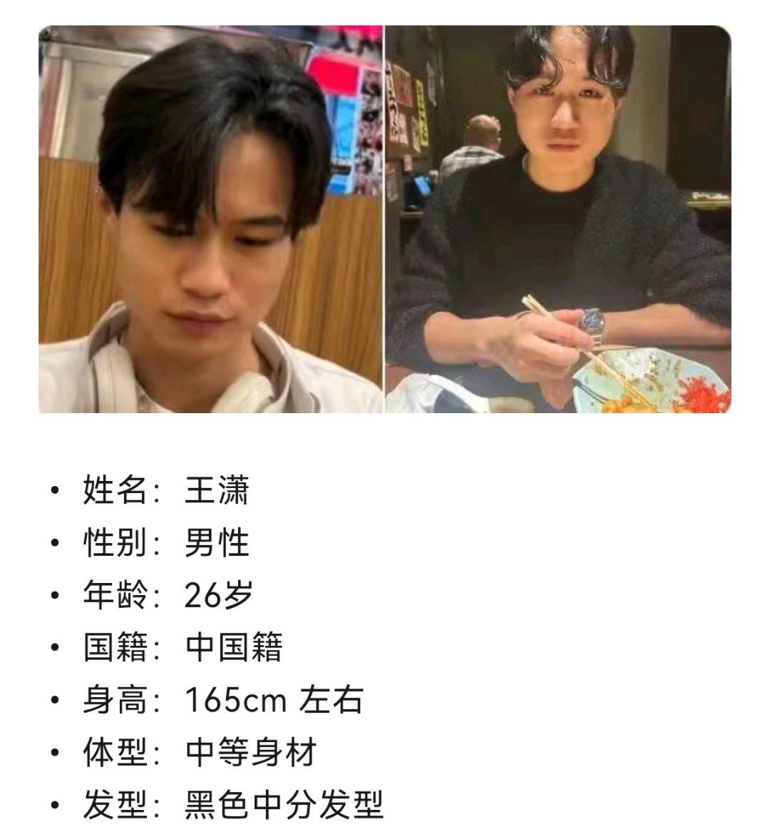 为便于识别,王女士补充了弟弟失联时的衣着特征:身着黑色卫衣、牛仔裤,脚穿耐克牌鞋子。“我们一家人日夜难安,心力交瘁,恳请所有在日同胞,若有任何关于王潇的线索,务必及时与我们联系,哪怕是一丝线索,对我们来说都是希望!”