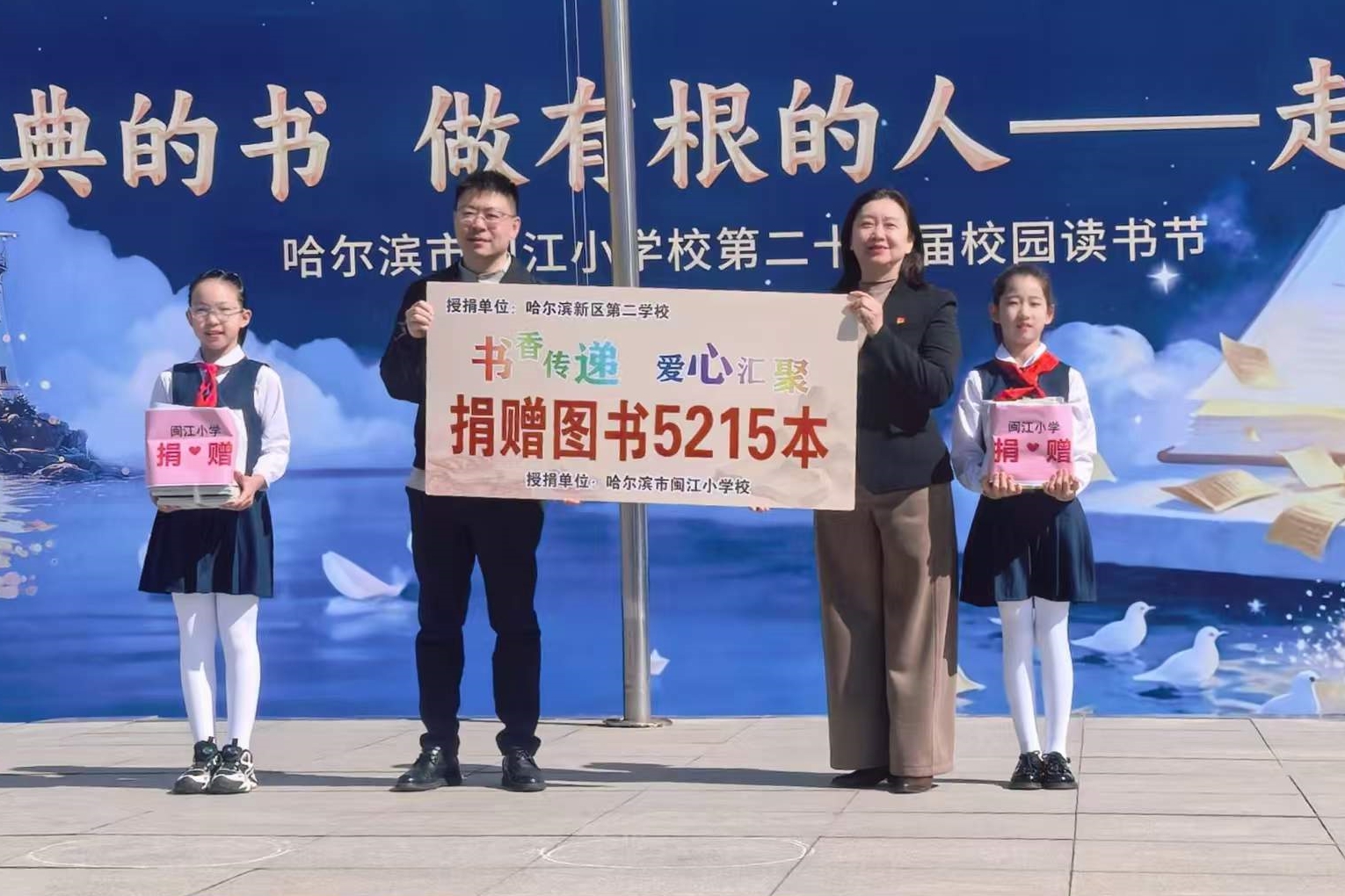 22日,哈尔滨市闽江小学校向哈尔滨新区第二小学爱心图书捐赠仪式温情举行。活动现场,黑龙江省希望工程捐助中心主任杜晶为哈尔滨市闽江小学校校长齐亚男颁发荣誉证书,对学校积极投身公益阅读、助力乡村教育的行动给予高度肯定。