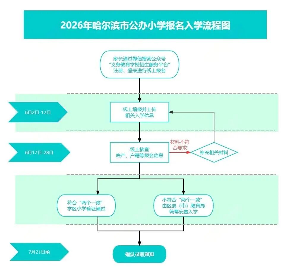6月2日—12日,进行网上报名、信息采集。符合入学条件的适龄儿童家长,须在“黑龙江省义务教育学校招生入学服务系统”(公众号“义务教育学校招生服务平台”)进行入学报名并上传相关入学信息。
